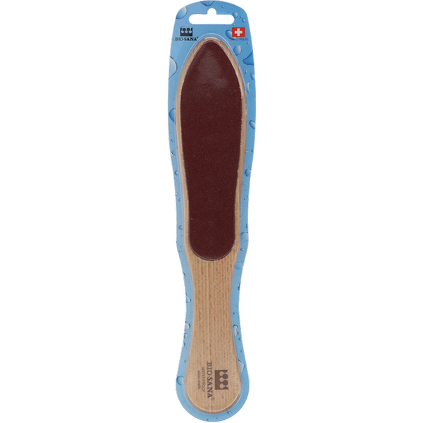 Dubbelzijdige houten eeltvijl met een grove kant (grit 60) om te vijlen en een fijne kant (grit 80) om de verhoornde huid glad te maken. Beide kanten zijn bedekt met een anti-bacteriële en waterbestendige slijpfolie. De Bio Sana-eeltvijl verwijdert eelt op een snelle en comfortabele manier. Handgemaakt kwaliteitsproduct van Zwitserse makelij.